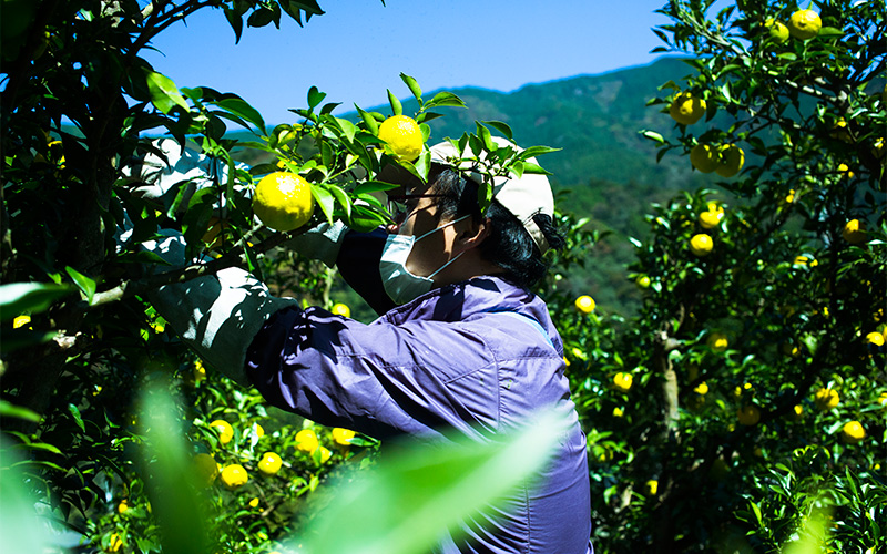 那賀町木頭地区では古くから柚子栽培を行ってきました。当社は自社栽培と契約生産者から、やりがいのある値段での柚子購入を実現し、地元生産者の所得向上と、新しい担い手の育成に貢献したいと考えています。